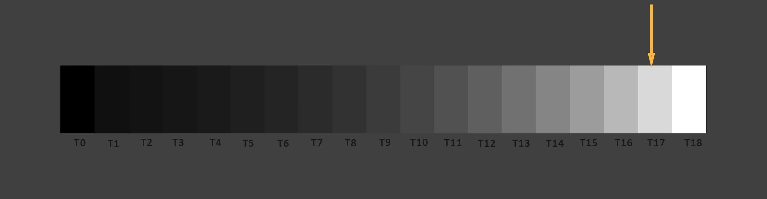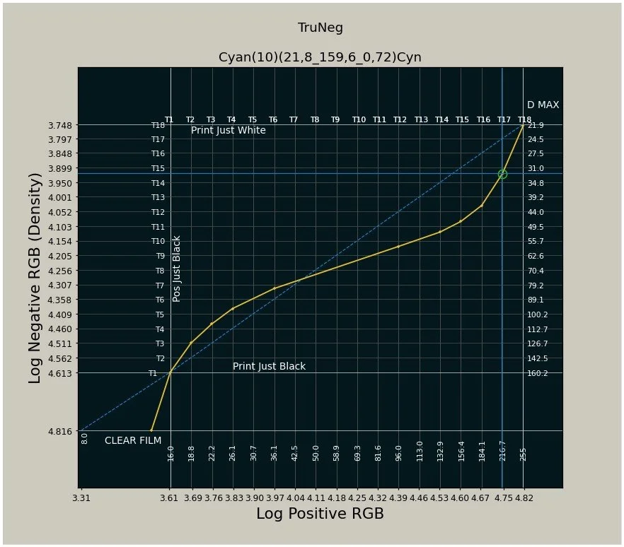 T17 is the first visible print tone and can have a significant effect on the curve, and should be checked against the Calibration test print. After saving the Preset, open the curves window, load the Preset and find the T17 RGB value on the RHS of the plot. In the Classic Cyan Preset shown to the left, the T17 RGB value is approximately 32, but in the Calibration print below, when 21.8 was selected as the “just white", RGB 32 is too light, and the RGB 39 step is the best match for the T17 tone in the TruNeg Stepwedge below. (The stepwedge can be downloaded from the website)